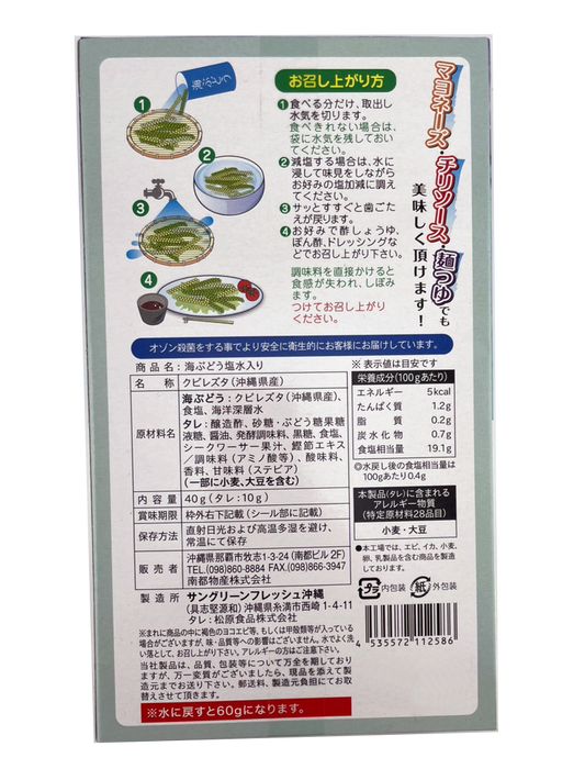 海ぶどう 40g (60g相当) たれ付き 2個で送料込 サングリーンフレッシュ シークヮーサー黒糖のたれ 沖縄県産 海洋深層水使用